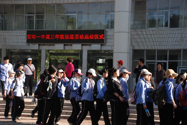 和分校2013届学生系列活动计划的一个重要组成部分。为了保障此次远足活动的顺利进行,学校及高三年级部作了精心的筹备,各部门通力合作。黄艳校长、董长生副校长亲自带队,全程陪同协调;德育处提前实地探察,设计出最安全最合理的路线,并于前一天召开参与老师动员会议,明确分工,详细研究各个环节;安阳市交警支队派专人沿途护送,保障交通安全;校医、校车全程服务,保障安全。