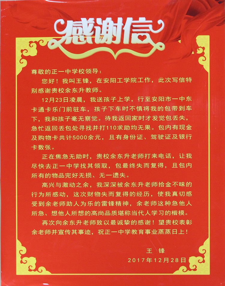 2017年12月23日早晨,余东升老师(现在安阳正一中学校区工作)送孩子上学途中行至卡通卡乐门店前捡到一个钱包,内有现金、身份证、有价证券以及多张银行卡等物品。为将钱包在第一时间归还失主,余老师让孩子自行上学,原地等待失主十数分钟。在没有等到失主的情况下,他才匆匆赶去上班。当天课后,余老师先后拨打114、12580,终于与失主取得联系,将钱包完璧归赵。失主要重谢余老师,被余老师婉拒。2018年1月8日上午,失主王锋将感谢信送到我校,学校才了解了事情的经过。