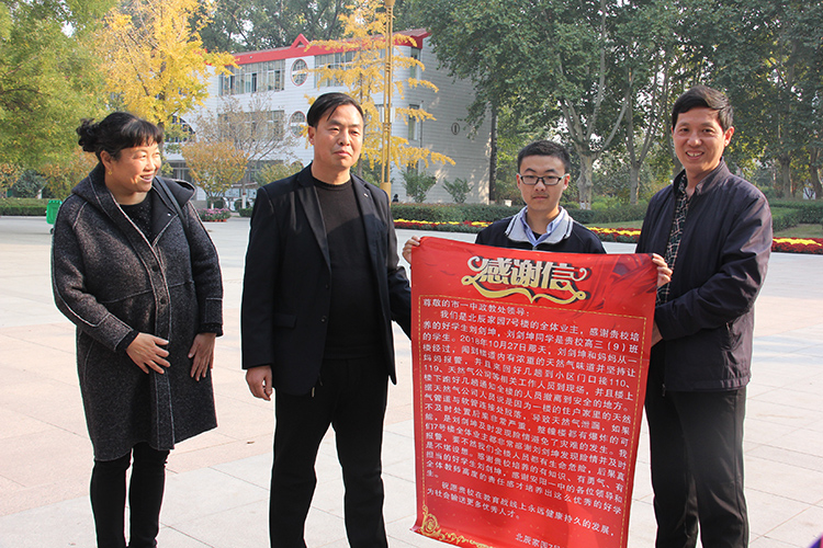 “谢谢你孩子,谢谢你救了咱们全楼人的命。”“感谢学校的领导和老师,谢谢你们教育出这么好的学生……”11月1日,家住北辰家园7号楼的十几名业主代表来到市一中送感谢信,感谢该校高三(9)班学生刘剑坤及时发现邻居天然气泄漏后报警,并帮助疏散邻居,引导消防员抢险,避免了更大灾难的发生。 10月27日19时许,家住北辰家园7号楼5层的刘剑坤和妈妈孙风芸打算到外面就餐。当他们从一楼经过时,刘剑坤闻到楼道内有浓重的怪味道,像是汽油味又像是打火机的燃油味。刘剑坤问妈妈是不是也闻到了怪味道,是不是天然气味?妈妈孙风芸急着到地下室提电瓶出门并没有太在意,刘剑坤便用手机搜索了一下,发现闻到的气味和天然气泄漏非常接近,他坚持要求妈妈报警,并告诉妈妈,如果天然气泄漏未及时处理会带来很严重的后果。为了确认到底哪泄漏,刘剑坤凑到一楼东西户的门缝前闻,发现怪味道是一楼东户散发出来的。随即,刘剑坤和妈妈拨打110电话,准确说明了险情发生的位置和情况,并和妈妈一起通知邻居关火关气离开家。 很快,市公安局北航分局民警孙曙光和辅警刘培文赶到,发现现场确实有浓重的天然气味道,并联系119和天然气公司专业人员。刘剑坤还及时骑电动车到小区门口为消防员带路。到达现场,消防员迅速切断供气供电,疏散楼上人员。随后,消防人员和天然气公司人员进入一楼东户家中,对房间内气体浓度进行了测量,对泄漏的天然气管道进行了有效处理并开窗通风换气。孙曙光介绍,此次事故原因是因为一楼住户家中天然气阀门未关,且天燃气管道与软管连接处脱落导致的泄漏,如果不及时处置后果非常严重。 当天,刘剑坤和班主任琚利利、学校领导一起接受了感谢信。刘剑坤说:“我觉得这是我应该做的,因为是老师教会我可燃气体易爆炸的知识,是学校教导我们要有安全意识,我也希望大家都能够提高警惕。”琚利利也说,刘剑坤有这样勇敢、机智的行为她也感到骄傲和自豪。同时,她也认为刘剑坤会这样做也是意料之中,因为学校定期对学生进行安全演练和安全知识的普及。她希望大家都能向刘剑坤学习,除了学习课本上的知识,更要有社会责任感。 beplay.lol 十分重视学生的安全教育,定期为同学们开设安全教育课,普及消防、防震减灾、交通、食品卫生、网络等多方面安全知识,还经常利用早校会和班会,不断强化安全意识。从上个学期起,学校要求所有骑车上、下学的学生佩戴安全头盔,保障道路交通安全,取得了良好的示范效果。 beplay.lol 希望所有的学生都能够像刘剑坤同学一样,有强烈的社会责任感和使命感,把自己的行为和国家、社会联系起来,努力增长才干,勇于担当,使我们的社会变得更加美好。