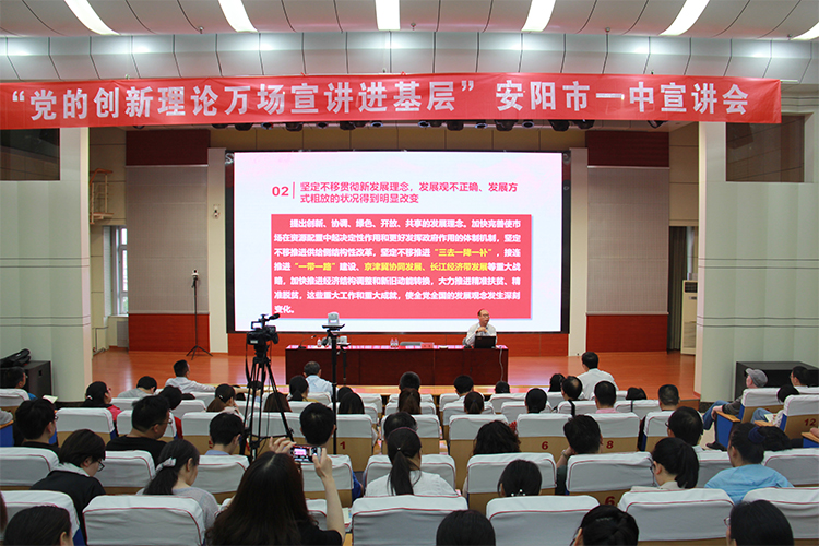 5月16日下午,“党的创新理论进基层安阳市第一中学宣讲会”在我校电教楼5楼报告厅举行。中共安阳市委党校管理学教研部副主任王勇教授,为我校全体教师做《深刻领会习近平新时代中国特色社会主义思想》报告。报告会由副校长王国卿同志主持。 王勇教授主要介绍了习近平新时代中国特色社会主义思想形成的客观依据,习近平新时代中国特色社会主义思想内涵及核心要义,以及毫不动摇地贯彻习近平新时代中国特色社会主义思想三个方面的内容。