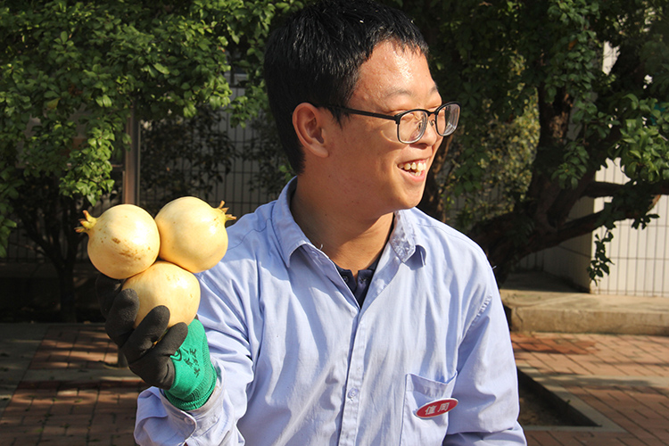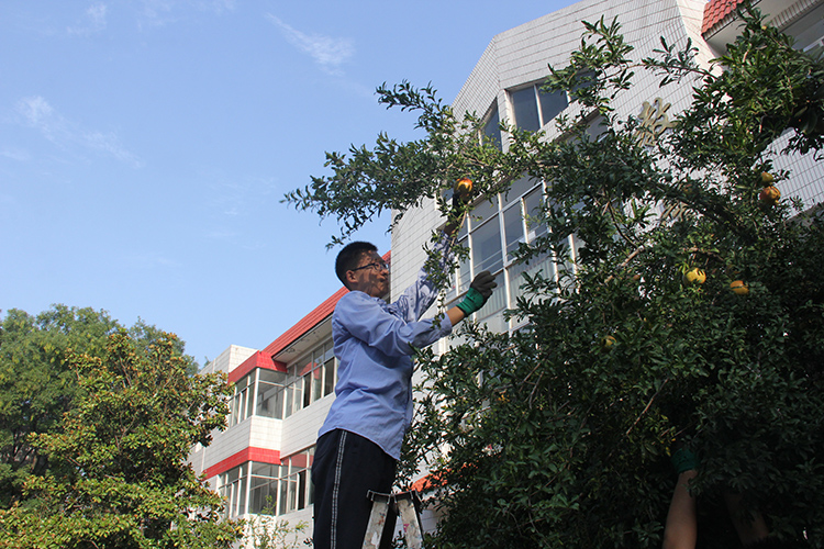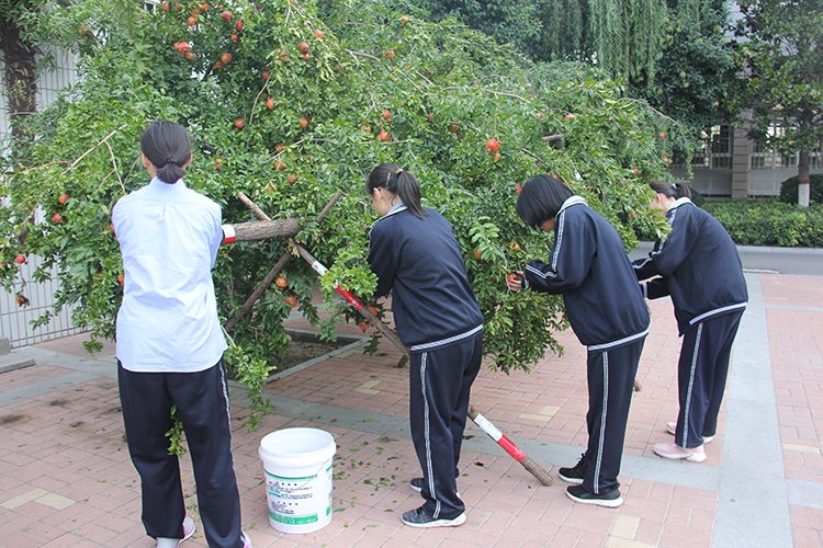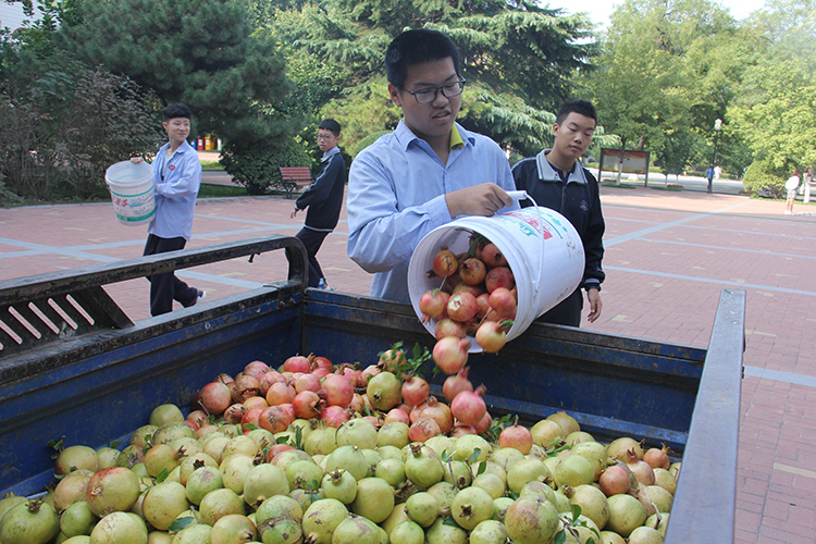 又是丰收的一年。教学楼前的石榴树已被满树的硕果压弯了腰,桂花的香气弥漫了秋日的校园。 到了一年一度摘石榴的日子,9月25日清晨,值周班绿化组的同学们在老师的带领下对校园内的石榴进行采摘。同学们分工合作,有的采摘低处的果实,有的踩着梯子够高处的,没多久就把树上的石榴全部采摘了下来。之后,学校总务处将石榴平均分到了每个班和老师的办公室,让师生一起品尝这份甘甜。 我们似乎已经习惯了果实挂满枝头的校园一景。石榴、杏儿、桃子……随手可得的果实却在一中的校园里被保护到成熟,虽属平常小事,却是全体师生文明素养的体现。‘’