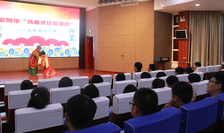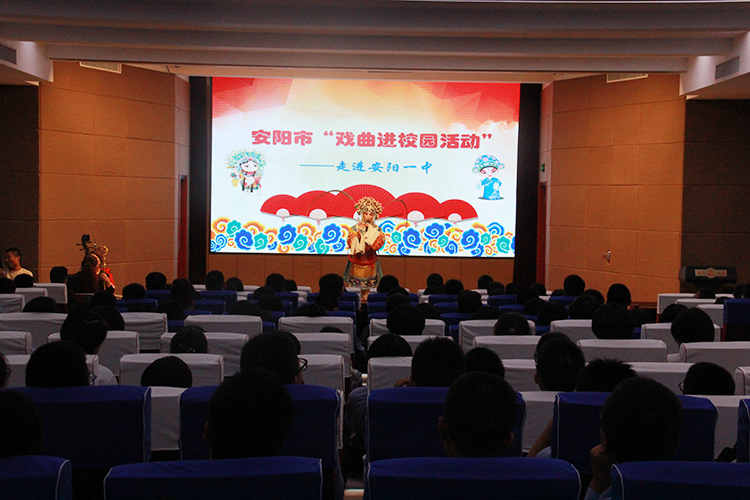9月19日下午,“戏曲进校园”活动在我校实验楼4楼报告厅举行。 安阳市豫剧团的表演艺术家们在副团长杨少龙的带领下,为同学们带来了精彩的豫剧唱段:《朝阳沟》《花木兰·路遇》《寻儿记·母子相会》《穆桂英挂帅·辕门外三声炮》……经典的豫剧唱腔,优美的戏曲身段,生动的故事情节,丰富的情感体验,让大家陶醉其中,活动现场不时爆发出热烈的掌声。 活动中,豫剧表演艺术家们还为同学们讲解了戏曲常识,表演了骑马、耍花枪等经典戏曲动作。同学们也积极参与互动,上台体验花枪技法,高一(八)班的王艺蒙同学还献唱了一段京剧《空城计》。 戏曲艺术作为中华优秀传统文化中的璀璨明珠,生旦净末丑、坐念唱打舞,融合了诗词歌赋、音乐舞蹈、武术杂技等传统艺术精华,是中华民族最具特色的文化形式。“戏曲进校园”活动,让同学们与传统戏曲亲密接触,进一步感受到了豫剧的独特魅力。 我校致力于通过开展各种活动,培养同学们健康的审美情趣和良好的艺术修养,不断推动加强和改进学校美育工作,传承和发展中华优秀传统文化,建设文明校园。