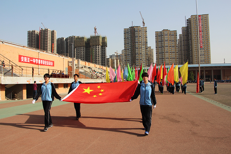 莺歌燕舞,柳絮飞扬。我校本着“与运动同行,与健康同在”,运动与健康并行,学生身心同发展的目的。4月22日,安阳正一中学春季田径运动会在学校操场隆重召开。 首先进行的是入场仪式。彩旗方阵第一个经过了主席台,随后是各班级代表队。整齐的步伐,洪亮的口号,昂扬的精神-----这是学生展现自己的时刻,更是开启激烈角逐的时刻。各班级代表队在经过主席台时,都充分展示了自己的特色与风采。待代表队入定之后,刘刚存主任为开幕式致辞,运动会正式开始。 泰戈尔在诗中说,天空没有翅膀的影子,但我已飞过。虽然运动场上不能久留运动员的身影,但运动员们奋勇争先,挥洒自己激情与汗水的模样,已留在同学心中。比赛进程激烈但有序,运动员展示了良好的竞争精神和竞技状态,创造了骄人的成绩。工作人员有序不乱,为本次运动会的圆满召开起到了有利保障的作用。 本次运动会的举办让学生在运动场上散发属于自己的活力,让学生偷闲于学习之外锻炼健壮的体魄。使学生能够在繁忙的学习之余,有时间享受运动带来的乐趣,以及培养学生的竞争精神,更有利于加深同学之间友谊,为班级建设提供帮助。 清风吹动,彩旗表扬,共同见证了安阳正一中学春季田径运动会的圆满成功。